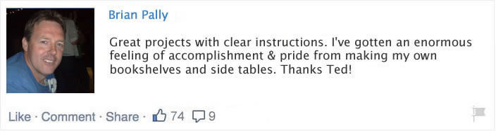 “I’ve been looking for something like this for the longest time. You get to learn how to design, detailed photographs of the projects, exploded blueprints, materials list and step by step instruction. It even shows you the different tools needed and how to use them and really explains the entire process to you.